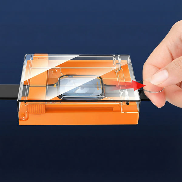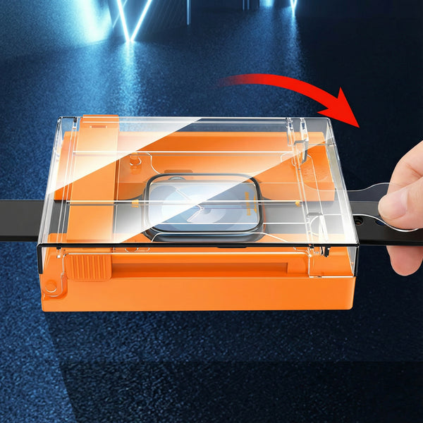 Press and slide the lid forward as indicated — the screen protector is applied automatically, bubble-free.